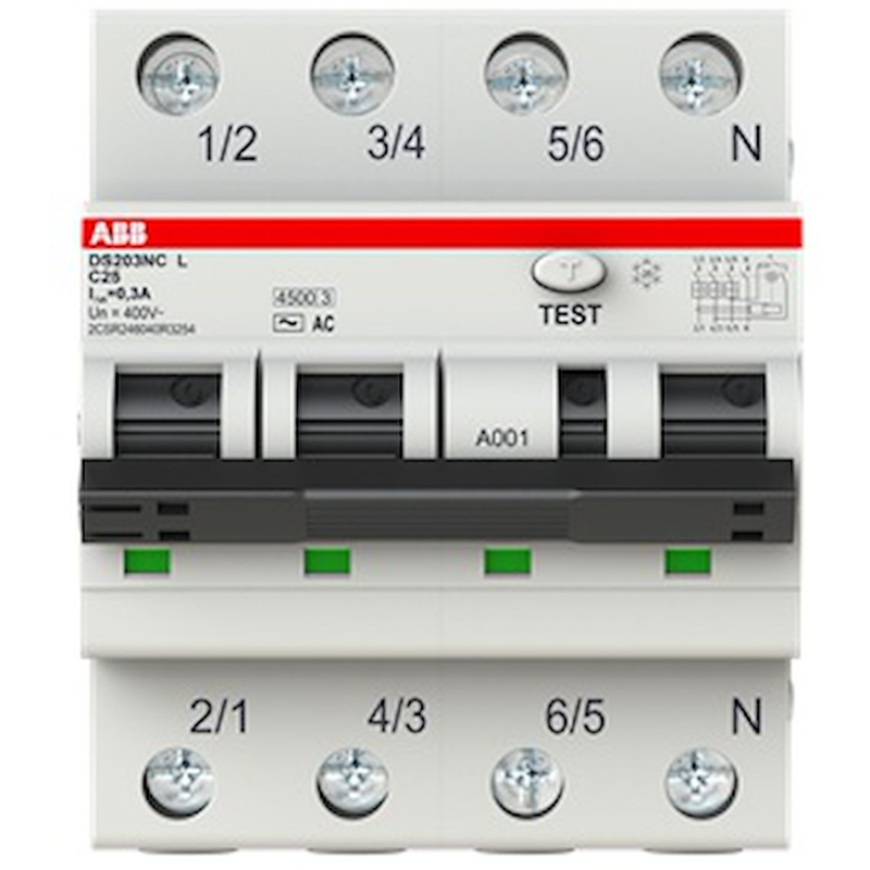Disjoncteur DIFF. Compact 3P+N (droite) 25A Icu-10kA CBE C 30mA type AC