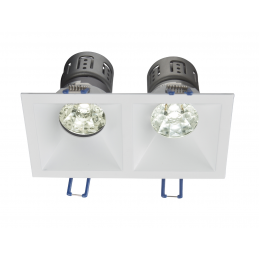 Spot DECO carré 2 têtes fixe, blanc mat, diffuseurs opale et transparent/nid d'abeille basse luminance, classe II, IP20, GU10, compatible volume salle de bain : non, RE2020, compatible isolants : non.