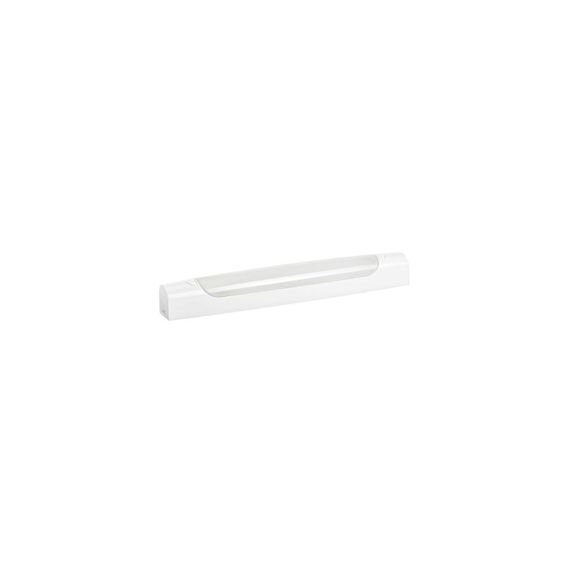 Réglette salle d'eau avec interrupteur, corps symétrique en polycarbonate blanc, IP44 IK07 autorisée volume 2, avec LED intégrées 6,3W 4000K, flux sortant 700 lumens, IRC90. Durée de vie : 20000H.