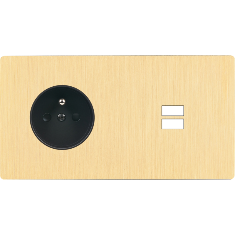 Placa de interrutor 'M' latão escovado duplo horizontal 1 ficha Schuko 1 Media magnético