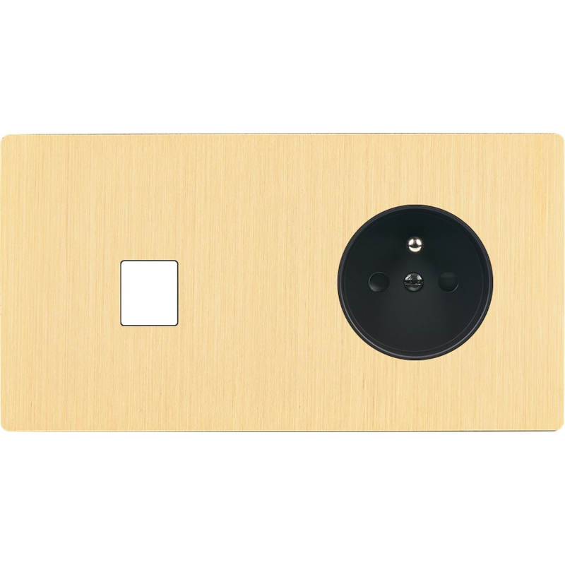 Placa de interrutor 'M' latão escovado duplo horizontal 1 ficha Schuko 2 Media magnético